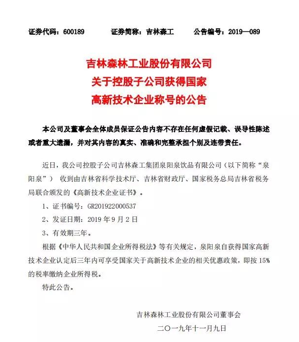? ? ? 根據(jù)科學(xué)技術(shù)廳、吉林省財(cái)政廳、國(guó)家稅務(wù)總局聯(lián)合頒布的《關(guān)于公布吉林省2019年第一批國(guó)家高新技術(shù)企業(yè)認(rèn)定結(jié)果的通知》,經(jīng)過(guò)層層審核,吉林森工集團(tuán)泉陽(yáng)泉飲品有限公司由吉林省科學(xué)技術(shù)廳、吉林省財(cái)政廳、北京市國(guó)家稅務(wù)局、國(guó)家稅務(wù)總局吉林省稅務(wù)局局聯(lián)合批準(zhǔn)下發(fā)的高新技術(shù)企業(yè)認(rèn)定。