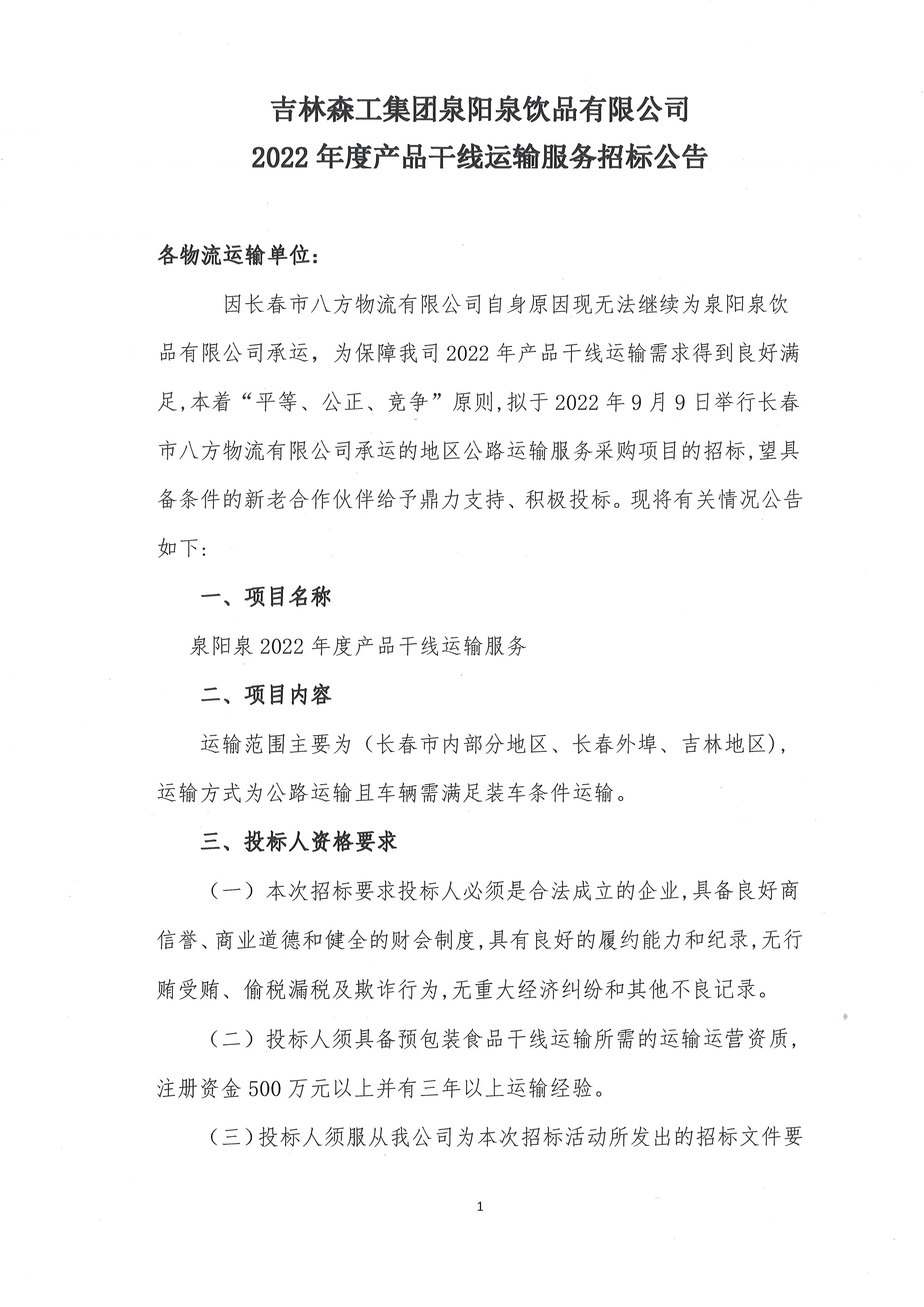 2022年度產(chǎn)品干線運輸服務(wù)招標公告